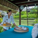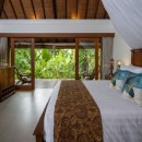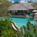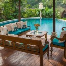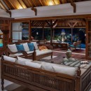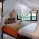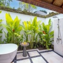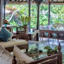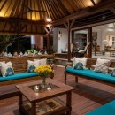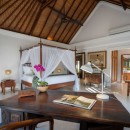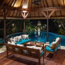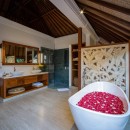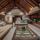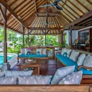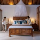 The indoor living pavilion connects to three of Villa Frangipani’s bedrooms. The kitchen connects, too, so you and your fellow vacationers can move easily throughout the home while you make memories. The master suite has luxurious mosquito netting around the bed and a wardrobe with large antique doors that will make you feel as if you are Indonesian royalty. There’s even a private outdoor bathroom complete with an open-air soaking tub and shower.