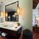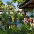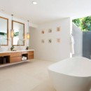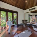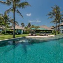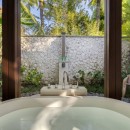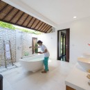 The bathrooms are truly luxurious, featuring deep soaking tubs, open-air showers surrounded by Bali’s greenery, large wood-framed mirrors, Bohemian-inspired light fixtures, and more. When you are done enjoying the modern interior of this impressive villa, feast your eyes on the extensive outdoor space.
