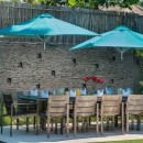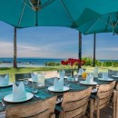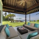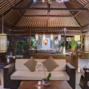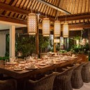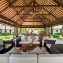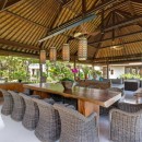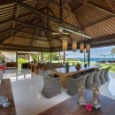 The superb open-sided living and dining area invites guests to gather. The open concept floorplan enhances the warm and welcoming charm of this luxury villa. The central living and dining space can easily accommodate twelve people, making it a premiere space to gather together indoors.