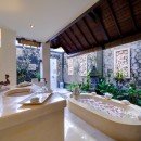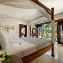 The bedrooms are rich with luxurious tropical charm. Canopy bedframes exude beachside opulence. Glassy, posh floors stand out with ornate rugs laid carefully on top. Wood-framed doors lead out to the beautiful garden space which is yours to enjoy during this stay.