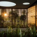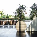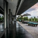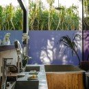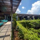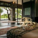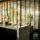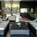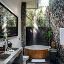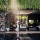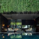 Outdoors, enjoy your private jungle oasis. Thick trees and vegetation surround your crisp and sparkling infinity-edge swimming pool. Plush seating can be found on the pool deck below a light filtering overhang, perfect for catching some rays while staying cool. Just beyond the edge of the pool, find plush round seating overlooking the lush garden below.