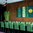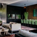 The extravagant living and dining area is complete with dark wood-paneled walls and a comfortable L-shaped couch. The dining table easily fits 12 people and exudes luxury with its dark finish and contrasting green chairs.