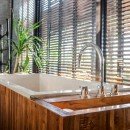 Bathrooms are spacious and luxurious, with double-sink vanities, wood-paneled soaking tubs, stone fixtures, and open-air concepts that let the tropical breeze roll in for optimal airflow. Enjoy a spa-level experience in this home with its upscale finishes and features in the bathroom.