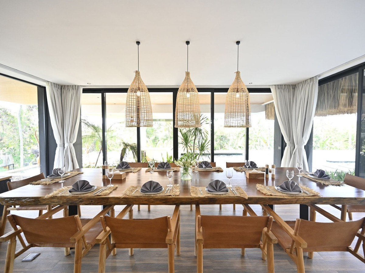 Begin your morning with sun salutations on the lush Sungai lawn. Glide into the 25-metre saltwater pool and swim up to the bar for a refreshing tropical smoothie. Lounge on the double sunbeds, cool off beneath the cascading waterfall, and enjoy a leisurely, butler-served lunch at the grand 4.4-metre dining table. Spend the afternoon in air-conditioned comfort in front of the 80-inch TV with Netflix, then gather for sunset cocktails in the soaring open-plan living space connecting the villa’s wings. As evening falls, retreat to the sunken pool lounge for a seafood barbecue prepared by the villa’s talented chef.