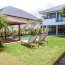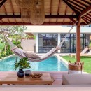 Nestled on a generous 700 sqm plot, the villa’s outdoor area is surrounded by lush tropical greenery and features a 7-meter swimming pool, inviting daybeds, and a charming gazebo with lounge furniture and a hammock—ideal for laid-back afternoons.