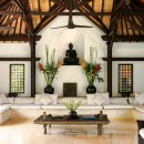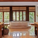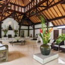Indoors, Villa Pangi Gita offers a glimpse into the rich tapestry of Balinese history and culture. Warm wooden interiors harmonize with elegant white furnishings, while soaring vaulted ceilings draw the eye upwards to the intricate iron wood-shingled roofs. Asian antiques and unique furnishings tell stories of discerning design and traditional inspiration. Glass walls seamlessly merge indoor and outdoor living, inviting you to bask in the generous open-sided living pavilion or relax in the traditional balé overlooking the pool.