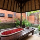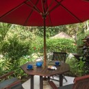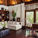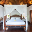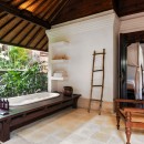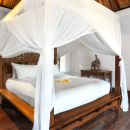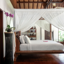 Perched at the highest point of the compound, two spacious guest bedrooms await, featuring queen-size four-poster beds and expansive garden bathrooms embraced by teak wood walls and lush greenery. Immerse yourself in the outdoor rain showers and bathtubs, a hallmark of Bali's barefoot living lifestyle. For those needing a quiet space to work, a study is also available, though we're certain your mind will be captivated by the serenity of Villa Pangi Gita.