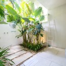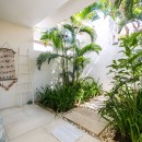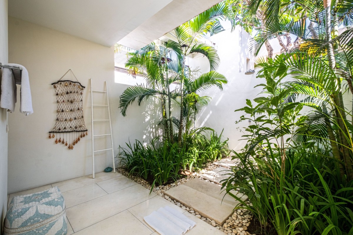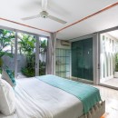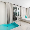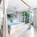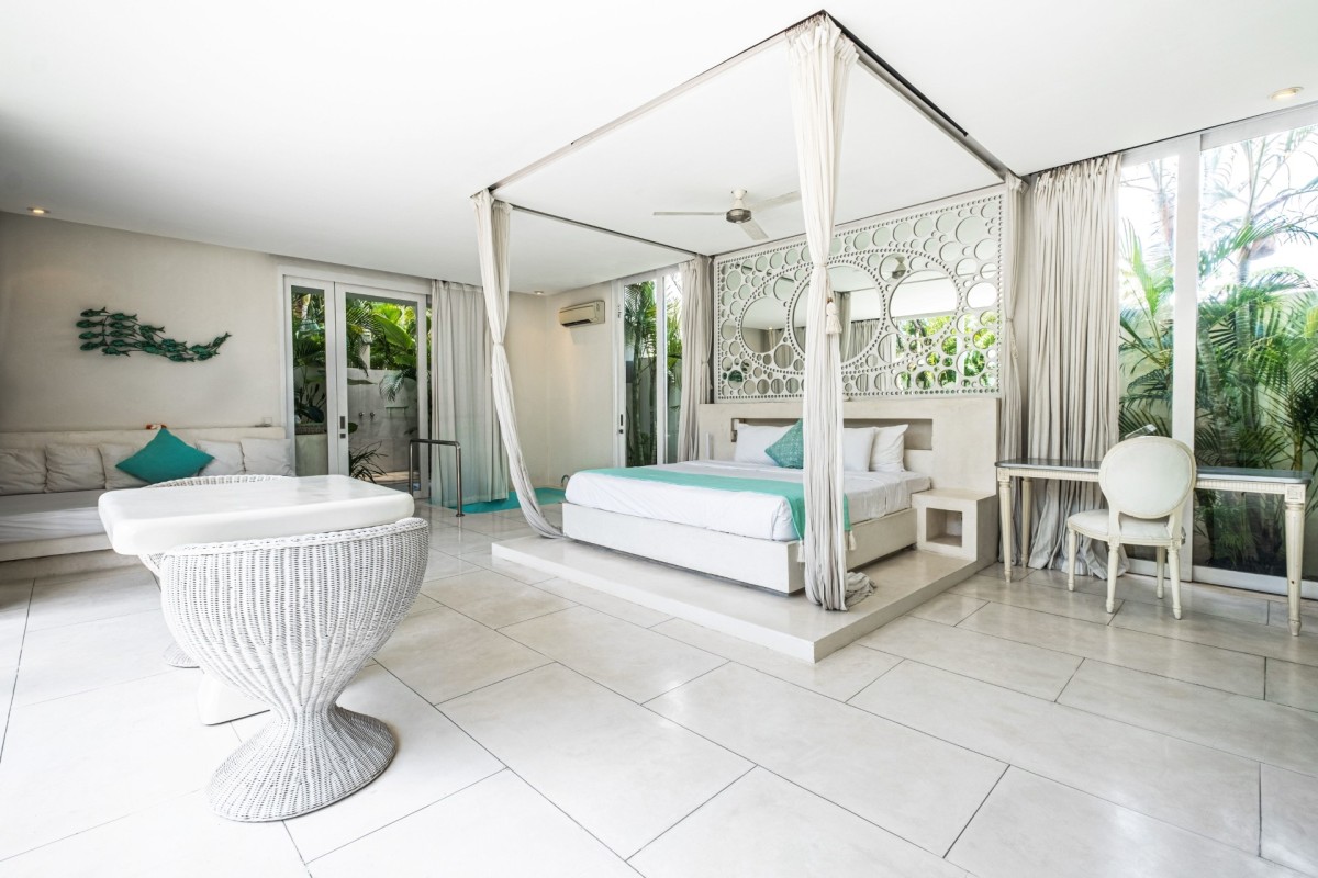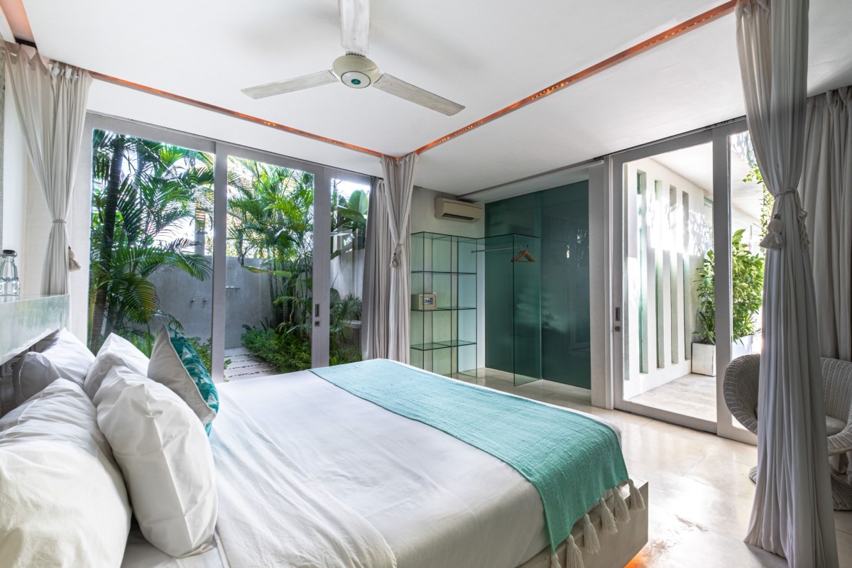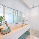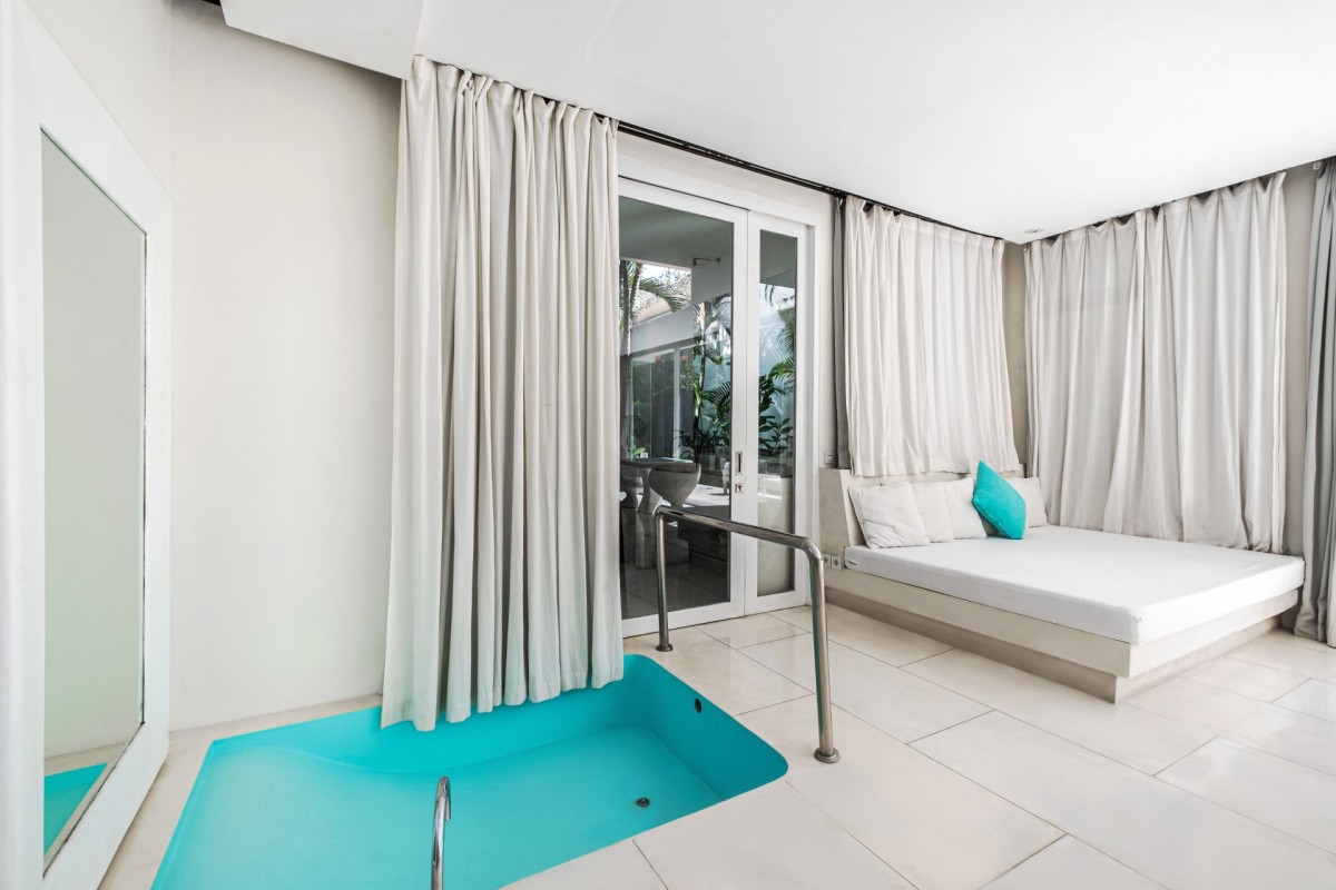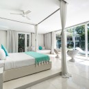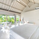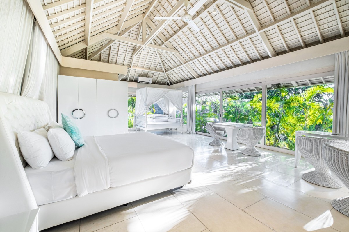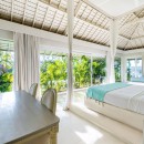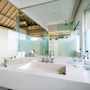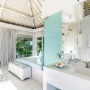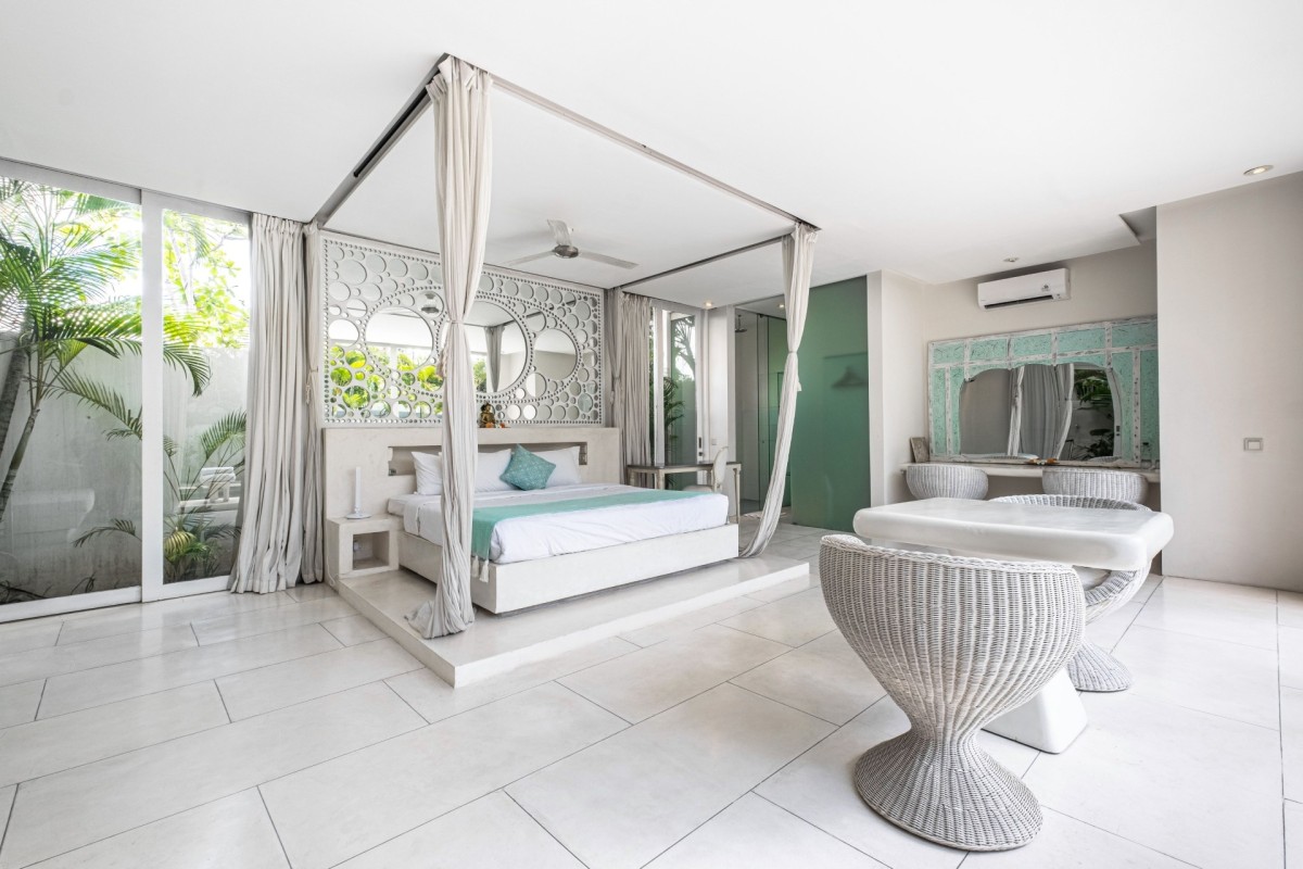 The villa offers five air-conditioned bedrooms, all designed in sleek white polished concrete. Each features a built-in king-size bed beneath a snowy netted canopy with an integrated ceiling fan, along with a walk-in closet. Three bedrooms are located on the ground floor, accessed via floor-to-ceiling glass doors. Two include sunken bathtubs with aqua accents, while all three boast indoor-outdoor bathrooms with dual showers—one inside and one open to the sky in a private walled garden.