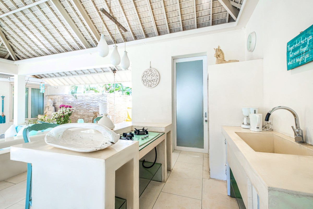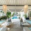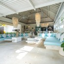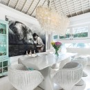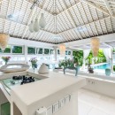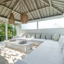 This pavilion also features satellite TV, a speaker system, and stylish accents, including a Buddha statue, a carved Javanese wedding couple, and bold artwork. The dining space features a white table with eight sculptural white cane chairs, alongside a compact open-plan kitchen with a breakfast bar, and a separate service kitchen tucked behind.