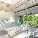 The two master suites upstairs are reached via a central staircase, watched over by a white Buddha statue. Both feature vaulted ceilings, a lounging area with a large daybed, picture windows overlooking the pool, and en-suite bathrooms with rain showers. A sheltered upstairs lounge with a generous built-in sofa offers the perfect space to unwind.
