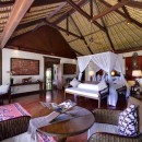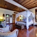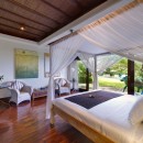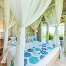 Bedroom 6: Bedroom with four-poster king-size bed, WiFi, A/C, ceiling fan, access to plunge pool, coconut grove view, and en-suite bathroom with bathtub, vanity, and WC. 2 guests maximum
