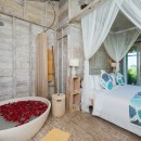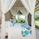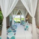 Bedroom 5: Bedroom with four-poster king-size bed, WiFi, A/C, ceiling fan, access to plunge pool, coconut grove view, and en-suite bathroom with bathtub, vanity, and WC. 2 guests maximum