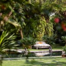 The landscaped gardens stretch across four beautifully terraced lawns. Koi ponds surround the entrance, with lotus ponds situated at the foot of the garden. Stone pathways and steps feature twinkling lights that are reminiscent of twinkling stars from dusk until dawn.