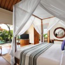 Bedroom 1: Ambhara Master bedroom with a four-poster king-size bed, WiFi, TV, lounge area, ocean view, private terrace, private pool, and en-suite bathroom with bathtub, indoor and outdoor shower, double vanity, and WC. 2 guests maximum