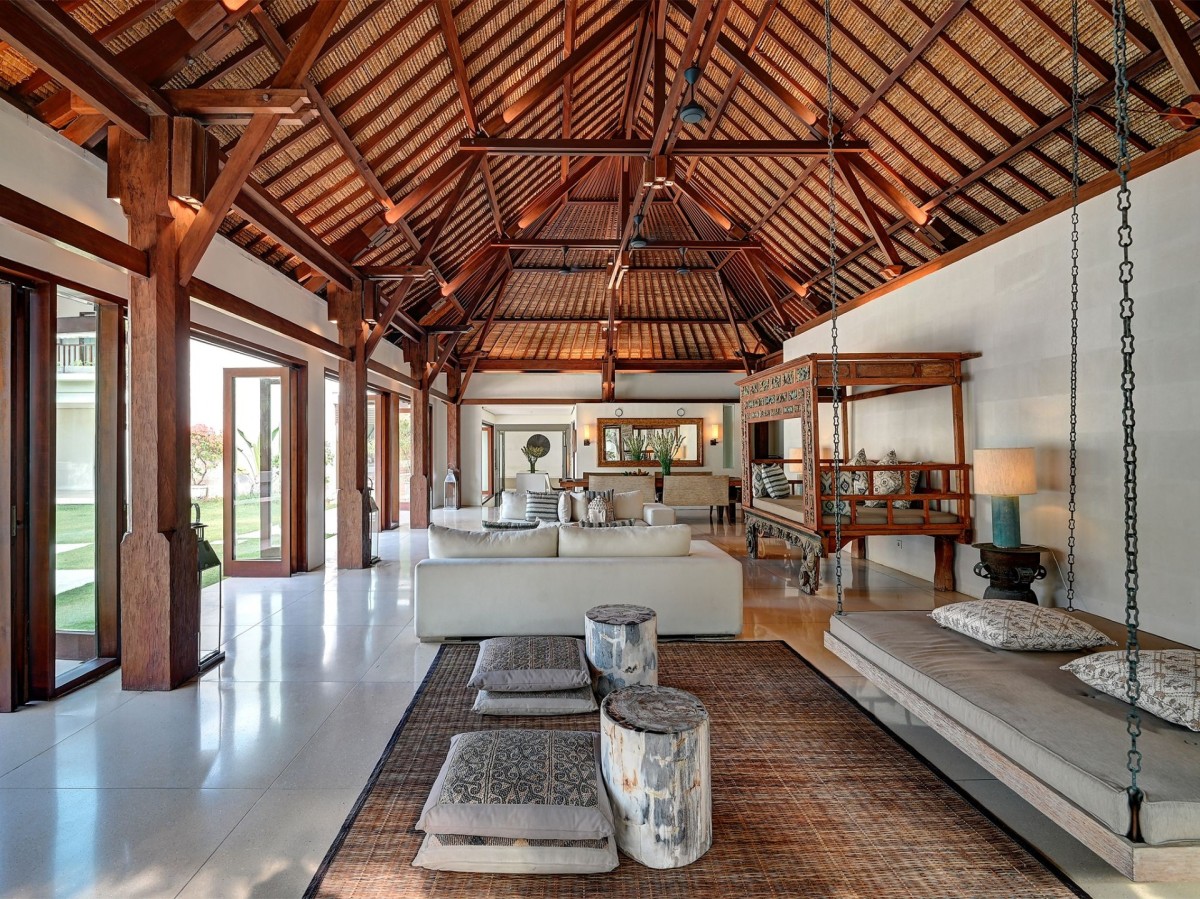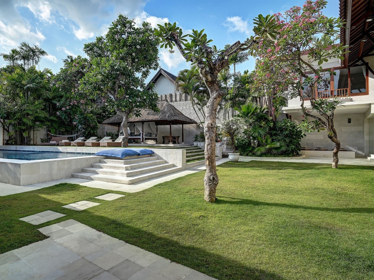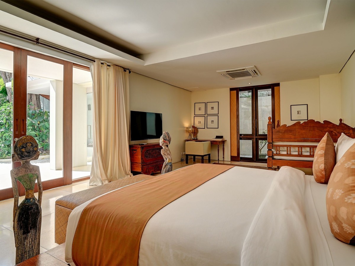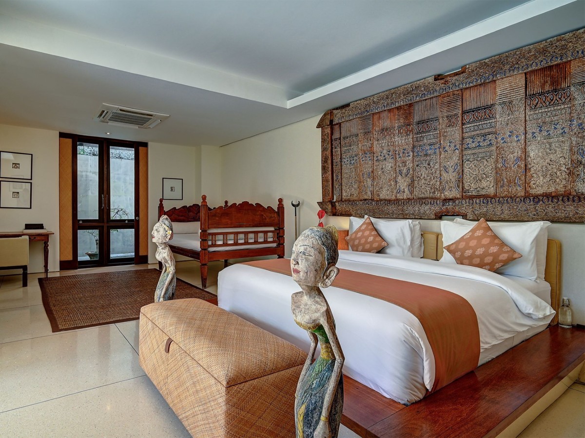 Thoughtfully styled with a nod to traditional Balinese aesthetics, the villa features local antiques, hand-carved furniture, and culturally inspired artworks. A tranquil Balinese Hindu temple graces the lush central garden, while the interiors include inviting touches like an ornately carved Javanese daybed in the living room and a breezy poolside bale perfect for afternoon lounging.