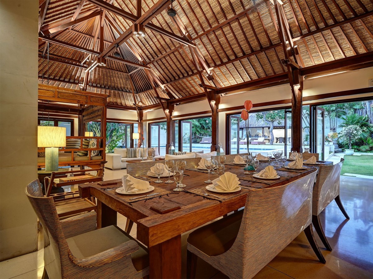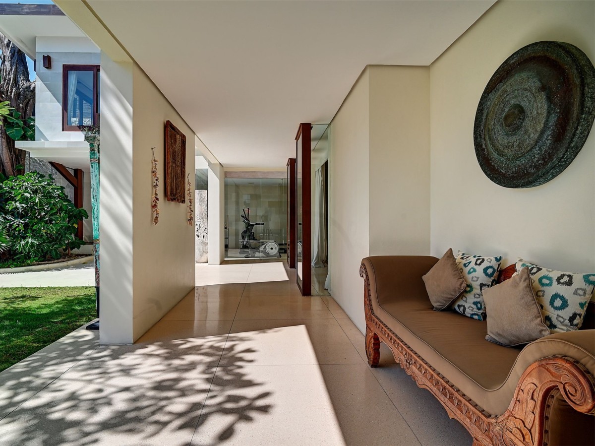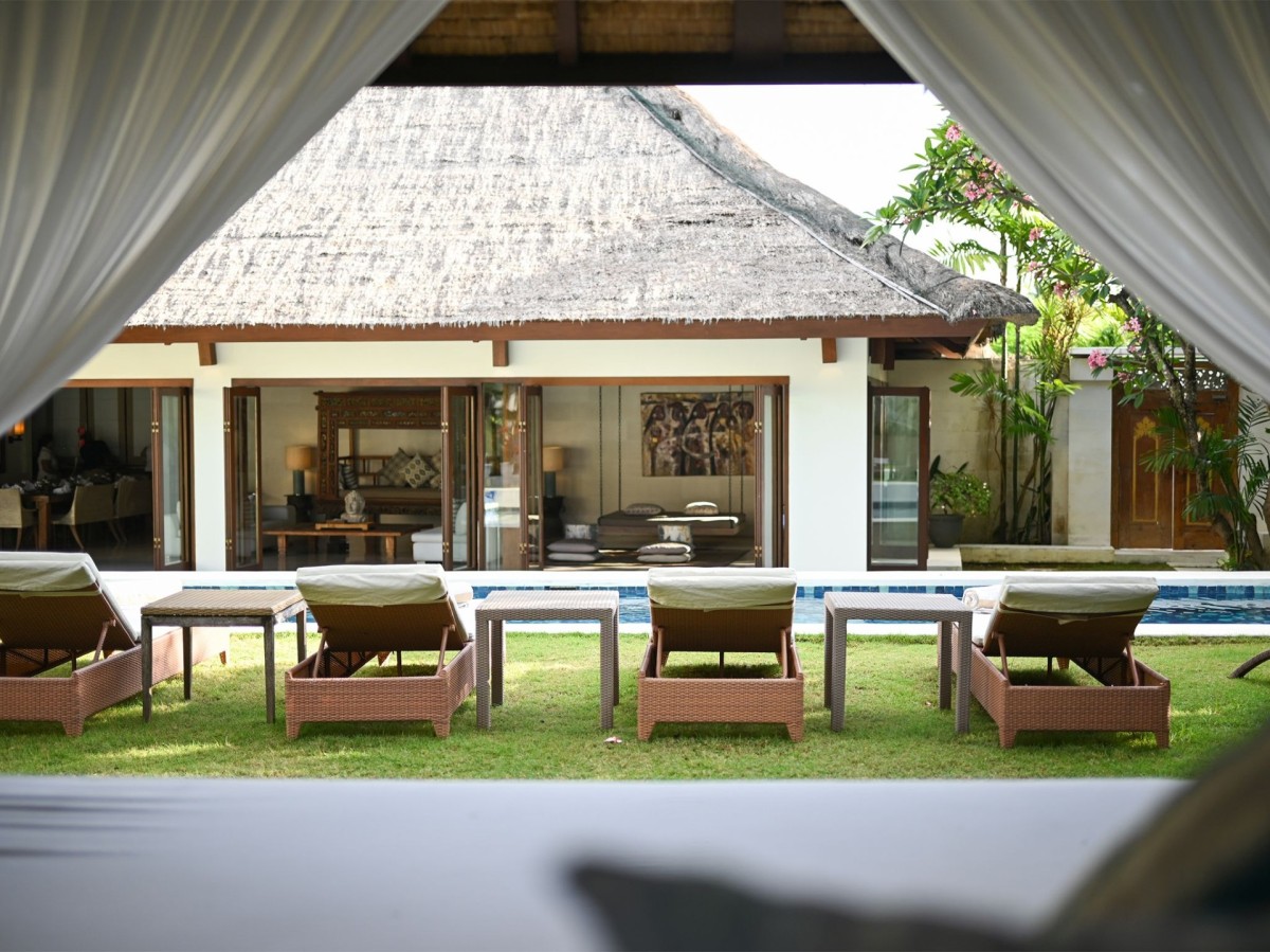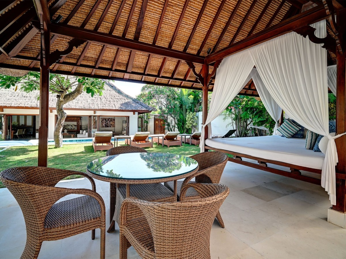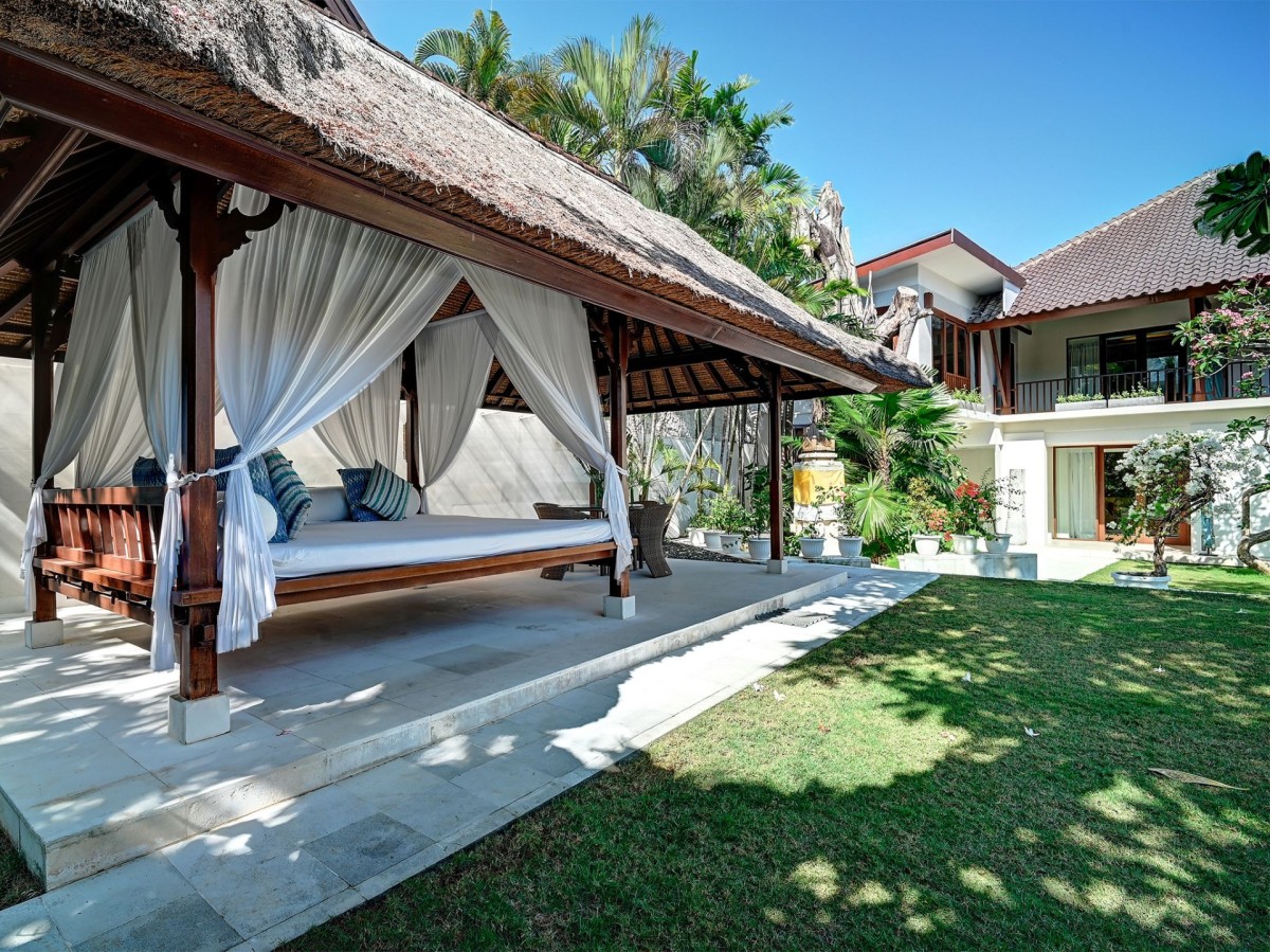 Thoughtfully styled with a nod to traditional Balinese aesthetics, the villa features local antiques, hand-carved furniture, and culturally inspired artworks. A tranquil Balinese Hindu temple graces the lush central garden, while the interiors include inviting touches like an ornately carved Javanese daybed in the living room and a breezy poolside bale perfect for afternoon lounging.