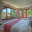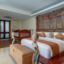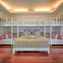 Bedroom 3: Upper floor Bedroom (Kids room) with one double bed and two bunk beds, A/C, WiFi, TV, walk-in closet, access to balcony with garden view, and en-suite bathroom with bathtub, rain shower, vanity and WC. 5 children maximum