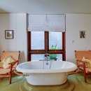 Bedroom 2: Upper floor Bedroom (Poster room) with a king-size bed, A/C, WiFi, TV, access to balcony with garden view, and en-suite bathroom with bathtub, rain shower, vanity and WC. 2 guests maximum