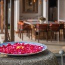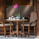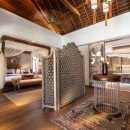 Bedroom 4: Upper floor bedroom with a four-posted queen-size bed, A/C, TV, dressing area, access to the veranda, private entrance across the koi pond, and en-suite bathroom with shower, vanity and WC. 2 guests maximum.