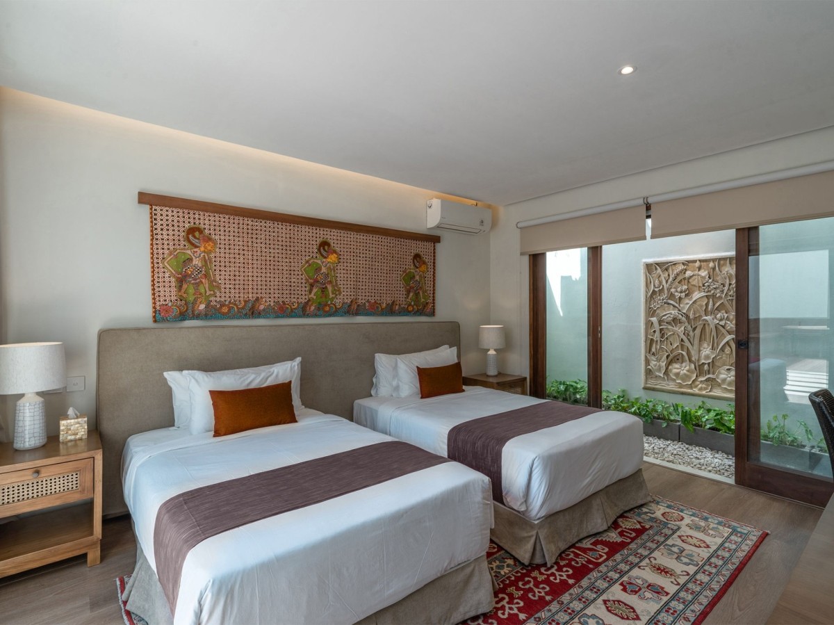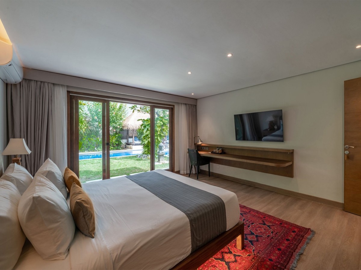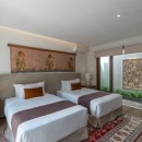 Each of the four bedrooms is comfortably appointed. Three open directly to the garden or pool, while the upstairs master suite features its own private balcony. The fourth bedroom, set up as a twin, can also serve as an air-conditioned study or workspace, making Villa Emmy an excellent option for families or those seeking a quiet retreat within reach of Seminyak’s lively atmosphere.