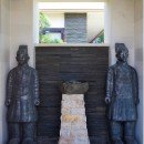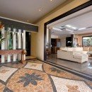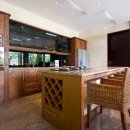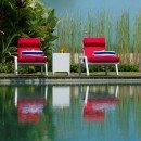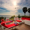 Although the indoor space is amazing, the outdoor space is just as breathtaking. This property is just a minute’s walk from the beach, so close you can feel the breeze. However, you may find it tempting to stay on the property, where you’ll find a luxurious swimming pool, upper outdoor deck, and lower pool deck, both sporting plush red chaise lounge chairs. Authentic sculptures and art are sprinkled in the outdoor space to add to the allure.