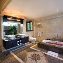 Immerse yourself in true luxury when you step into the bathrooms. They are spacious, luxurious, and welcoming with large vanities, soaking tubs, rainfall shower heads, and intricate textile finishes on the walls.