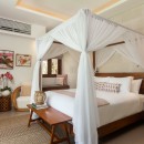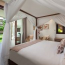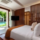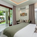 Bedroom 1: Lenu Master bedroom with a king-size bed, A/C, WiFi, TV, access to garden and pool, and en-suite bathroom with shower, double vanity, bidet, and WC. 2 guests maximum