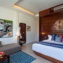 Bedroom 3: Nino bedroom with a king-size bed, couch, A/C, WiFi, access to garden and pool, and en-suite bathroom with shower, double vanity, bidet, and WC. 2 guests maximum