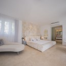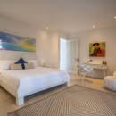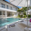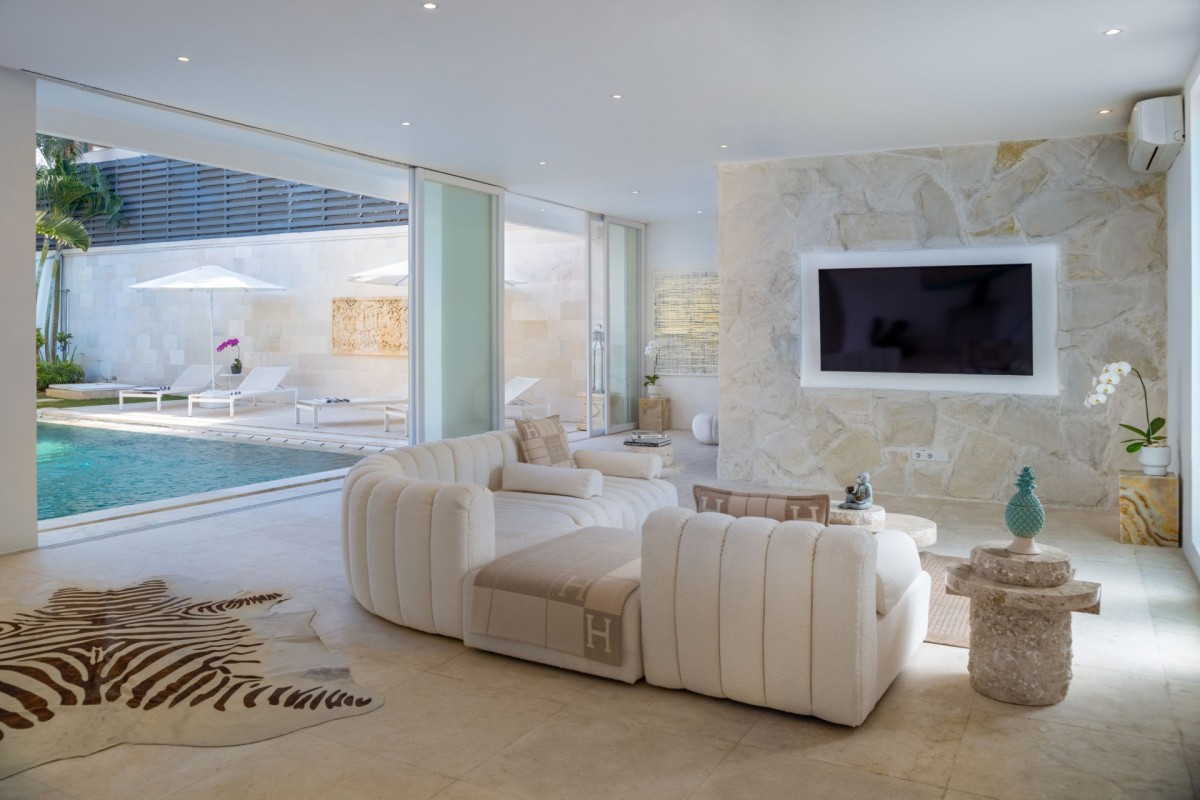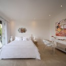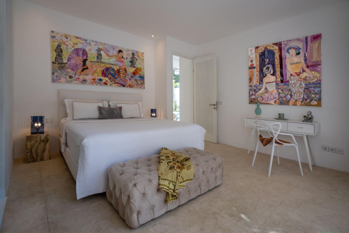 All four bedrooms are styled in a serene, snow-white palette. Three rooms feature king-sized beds, while the fourth boasts a super king bed, adding to the villa’s dreamy ambiance. Each bedroom has its own ensuite bathroom with a rain shower; the master suite includes a bathtub and twin vanities for added luxury.