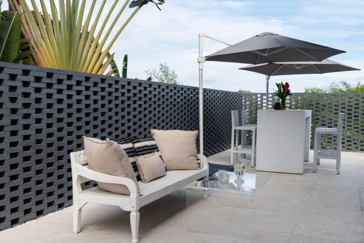 On the ground floor, the garden-facing dining room seats ten and connects to a stylish lounge with a 70-inch wall-mounted Smart TV. Both rooms offer the flexibility of air-conditioned comfort or breezy open-air living with direct access to the pool terrace. Upstairs, an open-air balcony offers the perfect spot for sunset cocktails.