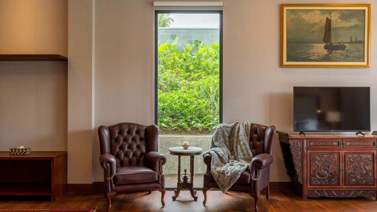 Bedroom 3: Ground floor Bedroom with a king-size bed, A/C, WiFi, TV, lounge area, and en-suite bathroom with bathtub, indoor and outdoor showers, vanity and WC. 2 guests maximum
