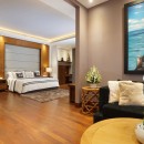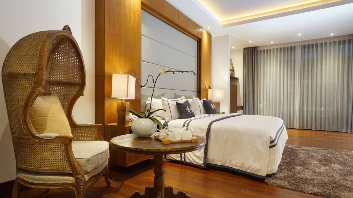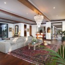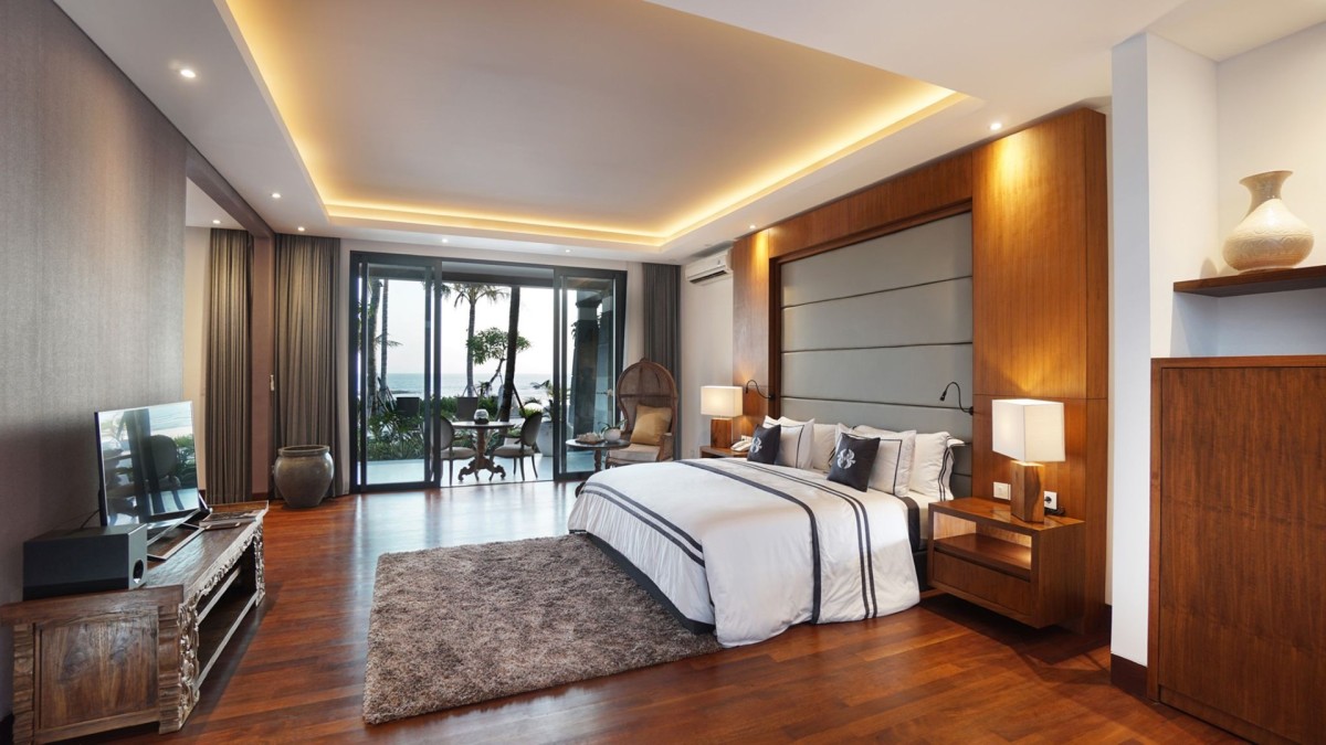 Stepping into Tirtha Bayu Villa II, you’re immediately greeted by a breathtaking vision of blue upon blue — the shimmering infinity pool blends seamlessly into the vast Indian Ocean beyond, creating a mesmerizing sense of endless flow. The scene is beautifully framed by swaying coconut palms, golden-tipped frangipani, and lush tropical gardens. Inspired by traditional Torajan architecture, the high-pitched roof of the central pavilion adds striking character to the villa’s design.