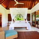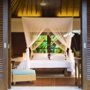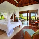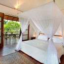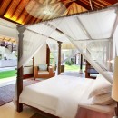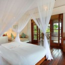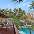 Bedroom 2: Umah ("House") bedroom with a king-size bed, A/C, ceiling fan, private deck, pool view, and en-suite indoor-outdoor bathroom with showers, bathtub, double vanity, and WC. 2 guests maximum (adjacent to Sawah (via an external walkway) can accommodate up to two extra single beds / extra bed & baby cot. )