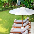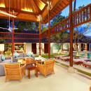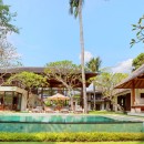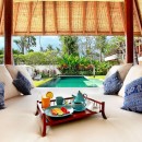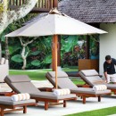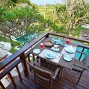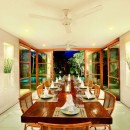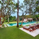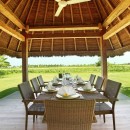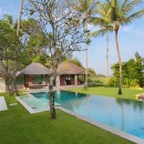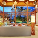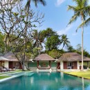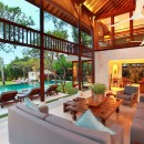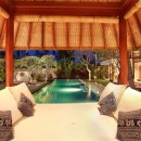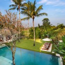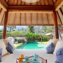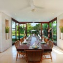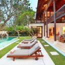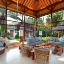 The superb open-sided living and dining area blends contemporary and bohemian, with white walls and touches of warm wooden features and classic Balinese sculptures. An impressive kitchen boasts white marble countertops with lots of under cabinet storage, perfect for catering to your dining needs.