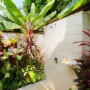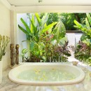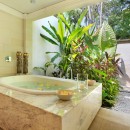 The bathrooms are light and luxurious, featuring marble encased soaking tubs, open-air showers surrounded by privacy walls and greenery, large mirrors with modern lighting, and more. When you are done exploring the beautiful interior, turn your sights to the outdoor space.