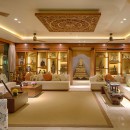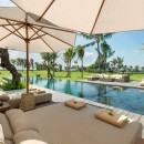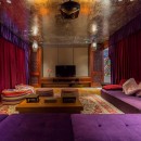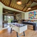 The high luxury atmosphere continues into the open-concept dining space, where you will enjoy beautiful golden cabinetry complete with Asian art, ornate fixtures, and a spacious dining table. This villa comfortably fits sixteen guests, perfect for a variety of special getaways. You’ll find several communal areas throughout, including the game room complete with foosball, an ornate theater room with plush seating, and more.