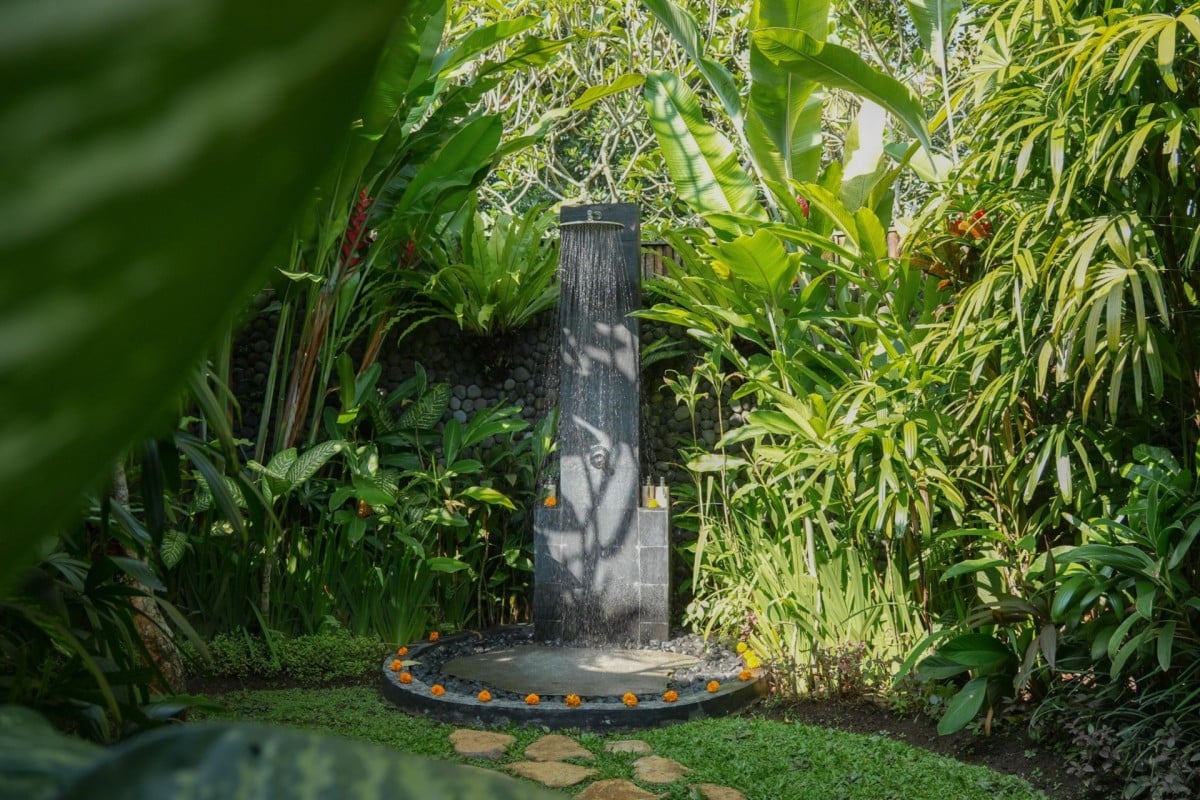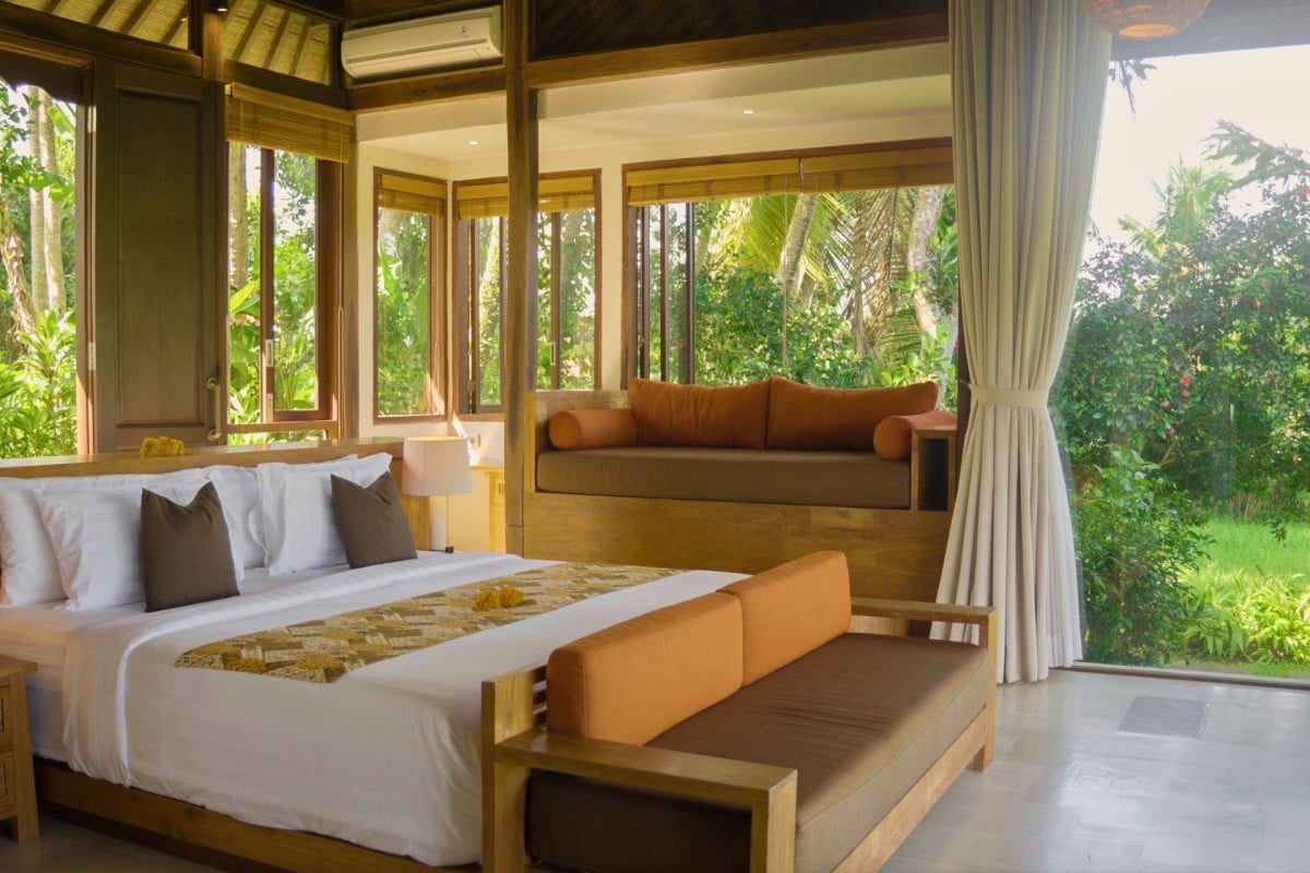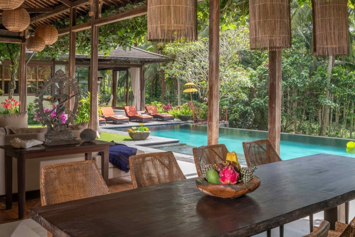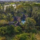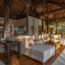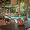 Set on a 4,600 sqm estate, the villa is arranged around a spacious open-air living area where deep, comfortable sofas encourage conversation and connection. From here, views extend across the pool to vibrant jungle, while the private yoga shala overlooks a rice field that transforms in colour and texture with the seasons.