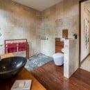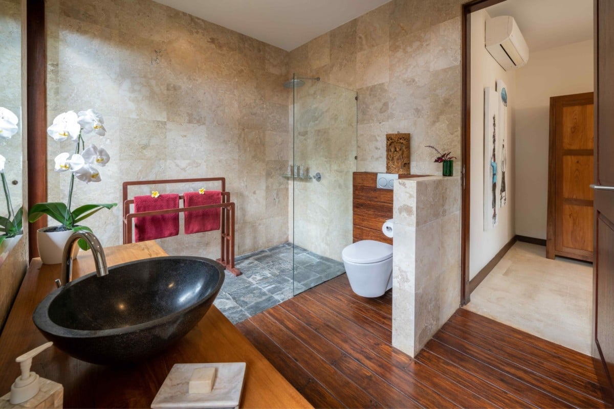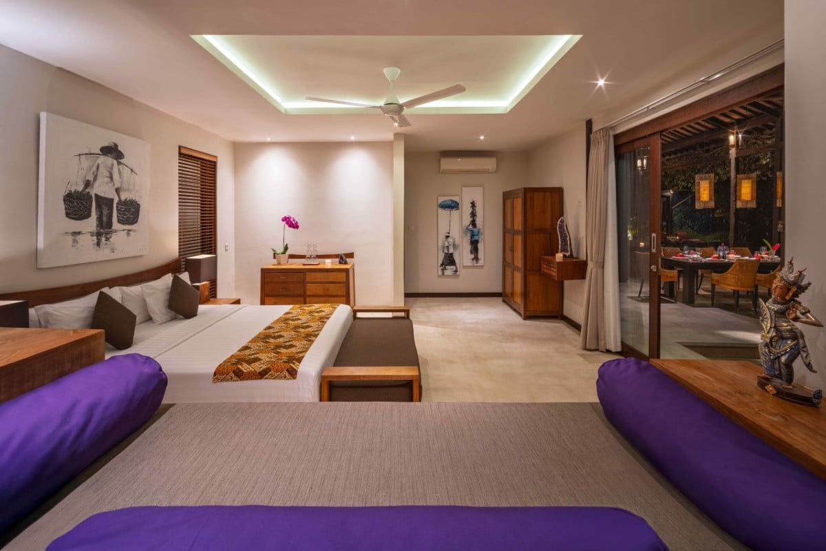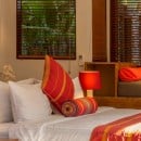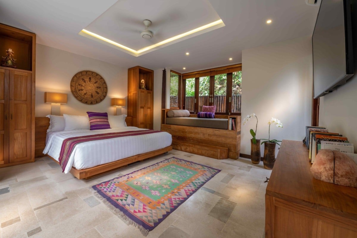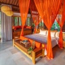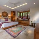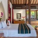 Bedroom 1: Tara's Temple Master bedroom with a king-size bed, A/C, ceiling fan, WiFi, safe, mini bar, access to the pool, and en-suite bathroom with bathtub, shower, double vanity and WC. 2 guests maximum.