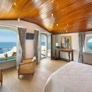 Bedroom 1: First floor bedroom with a queen-size bed, A/C, TV, sea view, access to plunge pool, solarium, outdoor shower and en-suite bathroom with Jacuzzi, shower, double vanity and WC. 2 guests maximum.