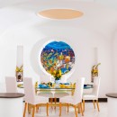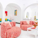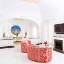Step into the spacious and luminous living room, adorned with a magnificent decorative fireplace and featuring a distinctive domed ceiling that adds to the expansive atmosphere. Through large French doors, the room opens up to a panoramic terrace, immersing you in the mesmerizing surroundings. Softening the room's clean white palette, a vibrant and comfortable long sofa, accompanied by upholstered armchairs facing a smart TV, invites relaxation. Adjacent to the living area, a dining alcove with neutral fabric-covered chairs contributes to the serene ambiance of the space.