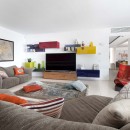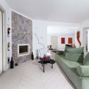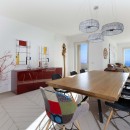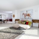 On the second floor, the second open-plan living area features a professional kitchen, ideal for preparing meals for large groups, with a double American-style fridge. The space extends into a spacious lounge and dining area, all beautifully furnished and adorned with contemporary art. The living room opens onto a large terrace, allowing seamless indoor-outdoor living.