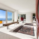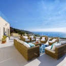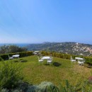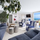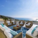 On the first floor, another spacious terrace is furnished with plush sofas and armchairs, while a third large terrace on the second floor offers a dining area and extends around the entire villa. The exterior is a collection of terraces, each offering dramatic sea views. In addition to the main terraces, there are several grassy lawns facing the sea, including one with café-style tables and chairs.