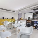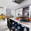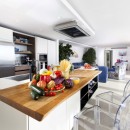 The villa offers two main living areas. On the ground floor, an open-plan living room is flooded with natural light thanks to floor-to-ceiling sliding glass doors that open directly to the terrace and pool. One end of the room features a large seating area with plush sofas and armchairs, while the other is home to a sleek kitchen island with a 5-burner hob and a minimalist dining table by the window.