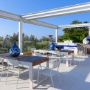 At Villa Hermes, the day revolves around the magnificent infinity pool, situated on the ground floor and surrounded by a sun deck with comfortable loungers. Two terraces, accessible from the villa, offer elegant seating areas with breathtaking views. One of the terraces features an outdoor kitchen with a retractable roof, perfect for enjoying al fresco meals. It includes a dining area, two stunning azure blue kitchen units with sinks, a hob, and a spectacular pizza oven. This is the ideal spot for casual meals or private chef experiences and pizza-making classes.