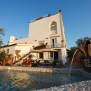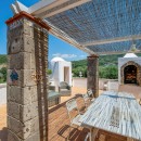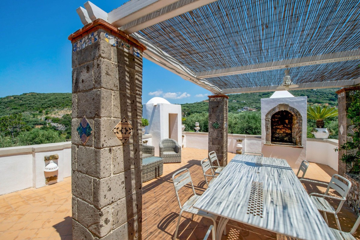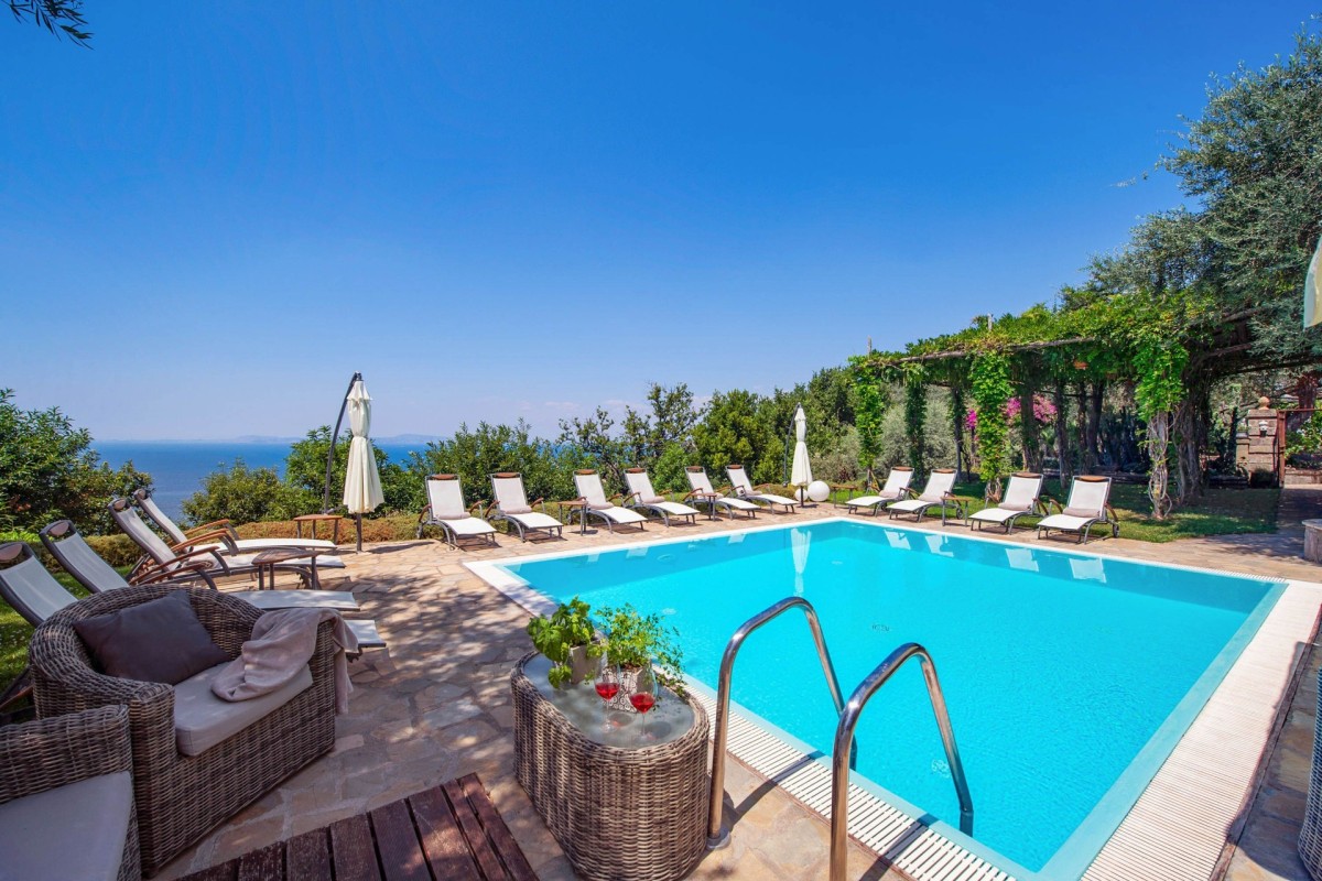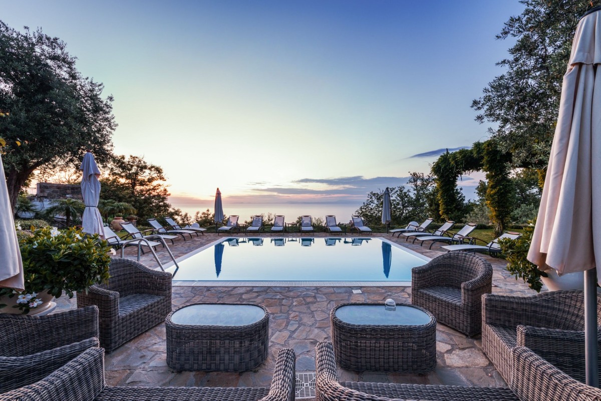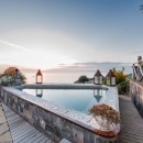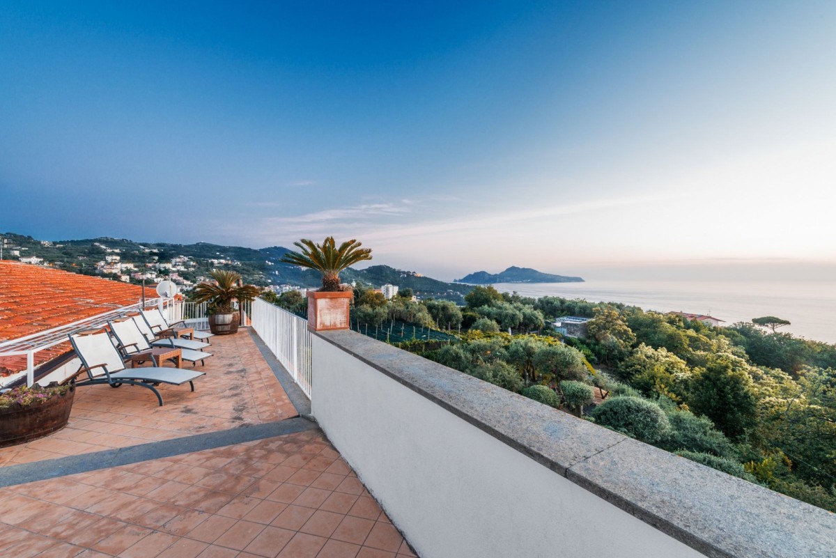 A spiral staircase leads to the panoramic rooftop, furnished with sunbeds and featuring an external shower. The property is adorned with several terraced manicured gardens and expansive flat lawns overlooking the sea, offering elegantly furnished zones for relaxation. The garden also features a convenient poolside loggia/veranda, complete with a wood-burning oven, BBQ facilities, and a professional-grade kitchen, allowing for delightful al fresco dining experiences. Enjoy a refreshing swim in the private swimming pool or unwind in the panoramic whirlpool, which accommodates up to eight people. An outdoor wellness area is also available for your relaxation and rejuvenation. In the evening, the pool, loggia, garden, and walkways are beautifully illuminated, creating a magical ambiance.