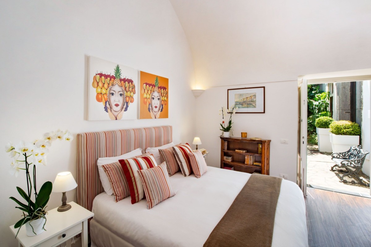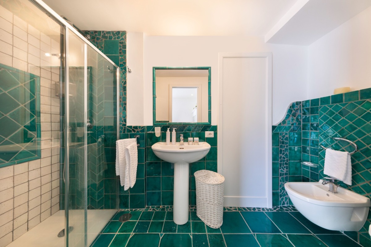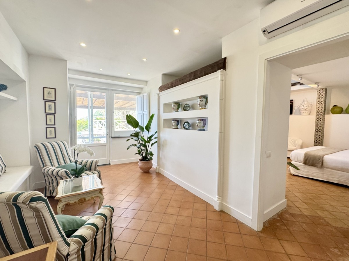 Bedroom 1: Ground floor bedroom with a queen-size bed, AC, TV, lounge area access to the terrace, sea view and en-suite bathroom with shower,vanity and WC. Independent entrance from the garden. 2 guests maximum.