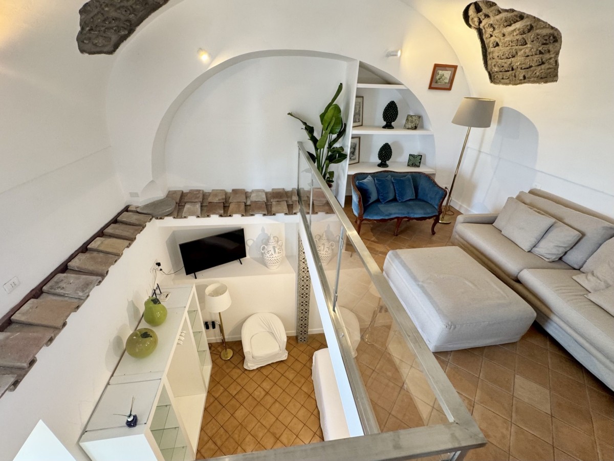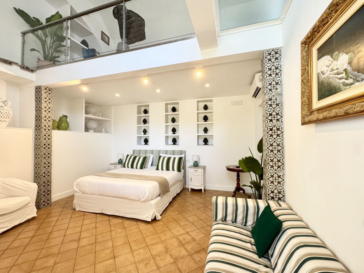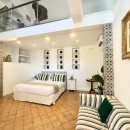 Bedroom 2: Ground floor mezzanine bedroom with a queen-size bed, AC, TV, lounge area, access to the terrace and en-suite bathroom with shower, vanity and WC. Independent entrance. 2 guests maximum.