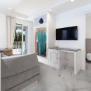 Bedroom 3: Bedroom with a king-size bed, double sofa bed, (more suitable for two children or one adult) A/C, TV, access through French windows to a private terrace and en-suite bathroom with shower, bidet, vanity, and WC. 2 guests maximum