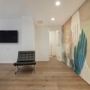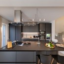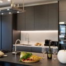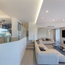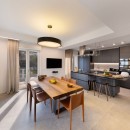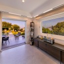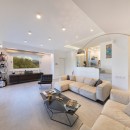 The well-lit interiors of the villa are tastefully designed and furnished to cater to those who appreciate modern and comfortable aesthetics. With ample space, the large rooms offer a perfect setting for relaxation and unwinding. The social space features a cozy sitting area with a large screen TV and a modern fireplace. A separate dining room (4 steps up) with its own TV features a generous table for 8. The striking open chef kitchen, complete with an island and breakfast counter, adds to the allure of the space. Additionally, a guest bathroom is conveniently located on this floor. The villa's exceptional quality is reflected in the carefully chosen materials and fabrics, keeping up with the latest design and décor trends. Expansive picture windows frame the breathtaking vistas, creating a captivating ambiance.