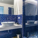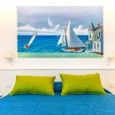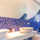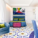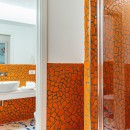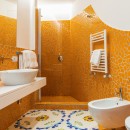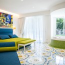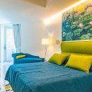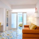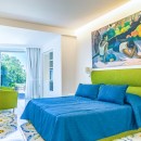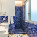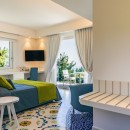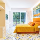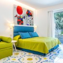 The interiors of Villa Sacco are equally spacious and inviting. Large sitting areas with floor-to-ceiling windows and stunning traditional ceramic floors offer comfortable spaces to unwind and socialize, away from the Amalfi sun's warmth. Air-conditioning is available throughout the villa, ensuring a pleasant indoor climate. Additional amenities include a lift, garage parking, and a remarkable modern kitchen fully equipped to cater to large groups, featuring a supersized double fridge and a full-height drinks cooler. The brightly colored bedrooms are individually designed and furnished, with most offering private terraces affording scenic sea views.